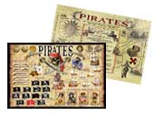 Front of placemat shows Famous Pirates, Pirates Flags, Ships, Weapons. The reverse side shows Pirates Code of Conduct.