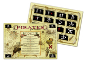 Front of placemat shows Famous Pirates, Pirates Flags, Ships, Weapons. The reverse side shows Pirates Code of Conduct.